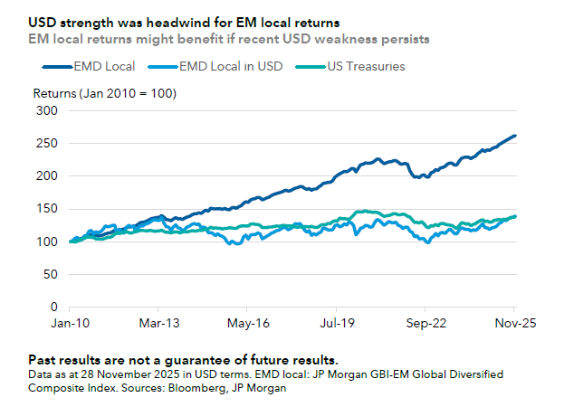 Esta dinámica podría abrir la puerta a que las divisas de los mercados emergentes obtengan aún más ganancias en 2026, pero los resultados serán cada vez más diferenciados entre regiones y divisas. Las divisas con alto carry, respaldadas por sólidos saldos externos y marcos políticos creíbles, son las que están en mejor posición para beneficiarse. América Latina destaca, con el real brasileño y el peso mexicano respaldados por bancos centrales disciplinados, flujos comerciales robustos y un entorno favorable para el carry.