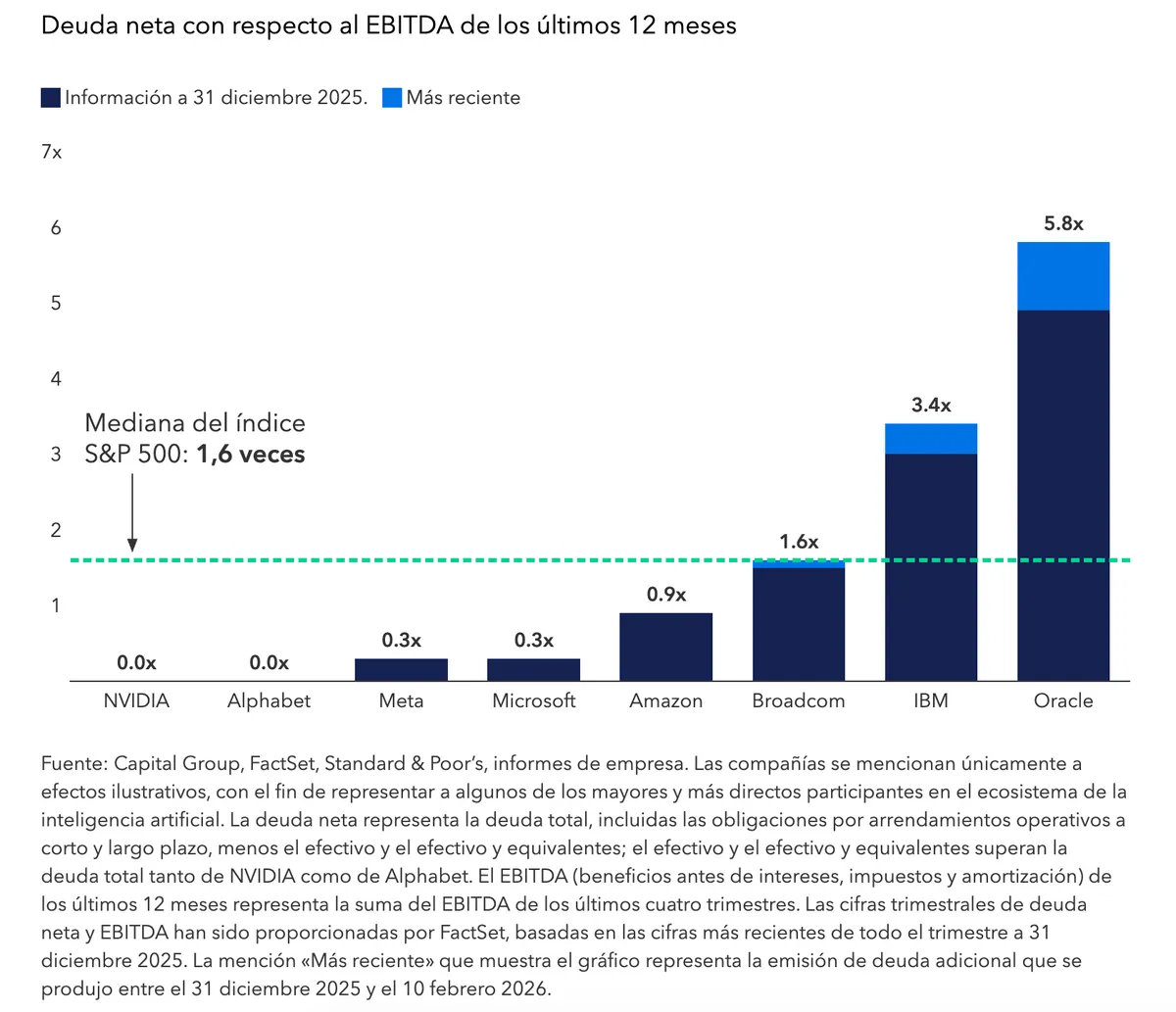 La mayoría de estas compañías tienen un bajo nivel de apalancamiento y emiten deuda para financiar el gasto de capital relacionado con la inteligencia artificial, lo que contribuye a optimizar su estructura de capital. «Dadas sus importantes reservas de liquidez y la solidez de sus flujos de caja, es probable que estas compañías puedan financiar estos proyectos por sí mismas, incluso teniendo en cuenta el aumento del gasto de capital», explica McCann. «En mi opinión, esto reduce los riesgos sistémicos de manera considerable».