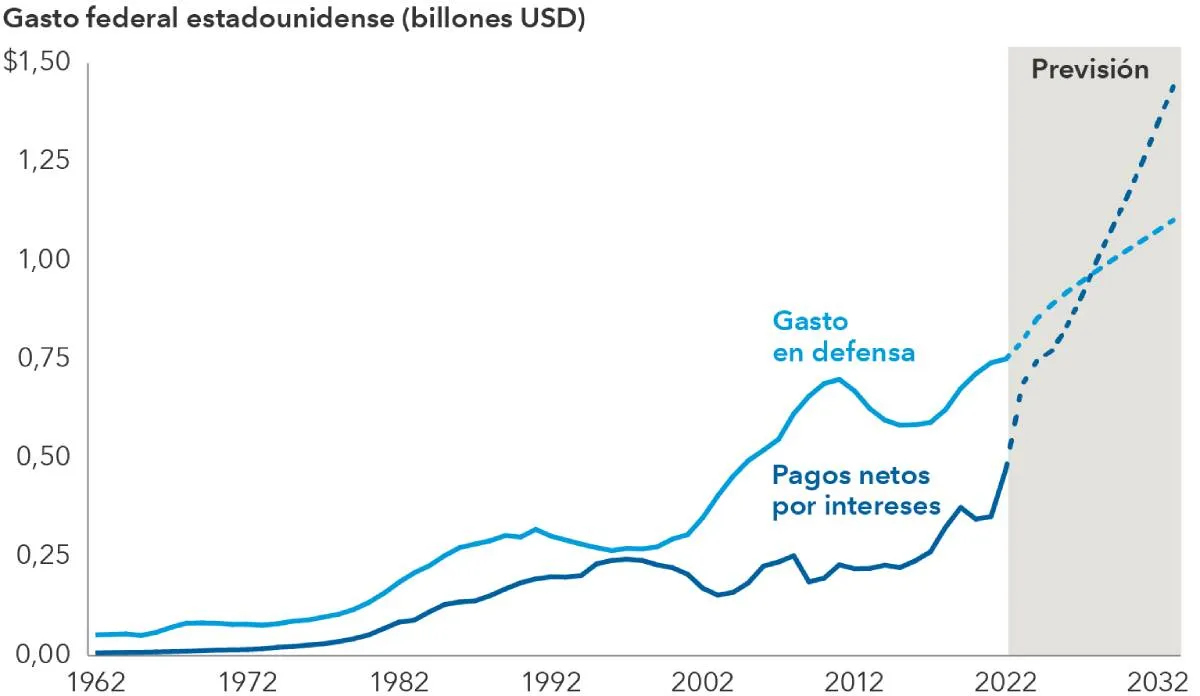 Dicho esto, la dinámica de la deuda estadounidense está evolucionando de una forma que requiere nuestra atención. Se prevé que, en los próximos cinco años, los pagos netos por intereses de la deuda superen el gasto en defensa. A lo largo de los próximos diez, estos pagos por intereses podrían aumentar de los 476.000 millones de dólares a 1,44 billones, lo que significa que, en 2033, los intereses consumirán un 10,6% adicional de los ingresos públicos.