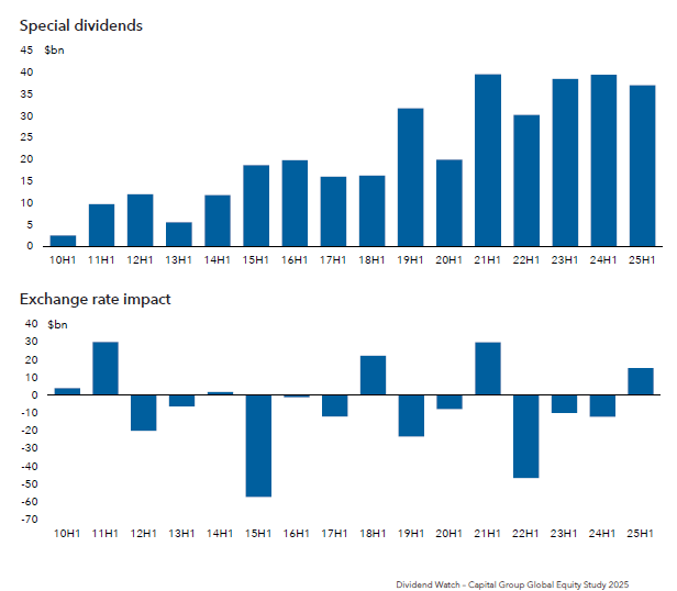 La cifra total que se recibe vía dividendos es sin duda real para los inversores, pero está influida por una serie de factores que pueden ocultar la tendencia de crecimiento del dividendo core. Los dividendos extraordinarios puntuales (pagados, por ejemplo, cuando una empresa se desprende de un activo importante), las fluctuaciones de los tipos de cambio y los efectos del calendario (cuando las empresas cambian el momento de sus distribuciones) pueden impulsar o frenar significativamente la tasa de crecimiento total.