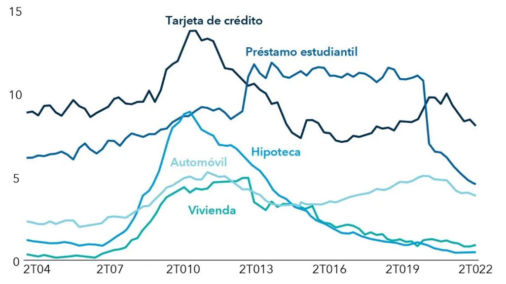 Prestatarios con más de 90 días de impago por tipo de préstamo (%)
