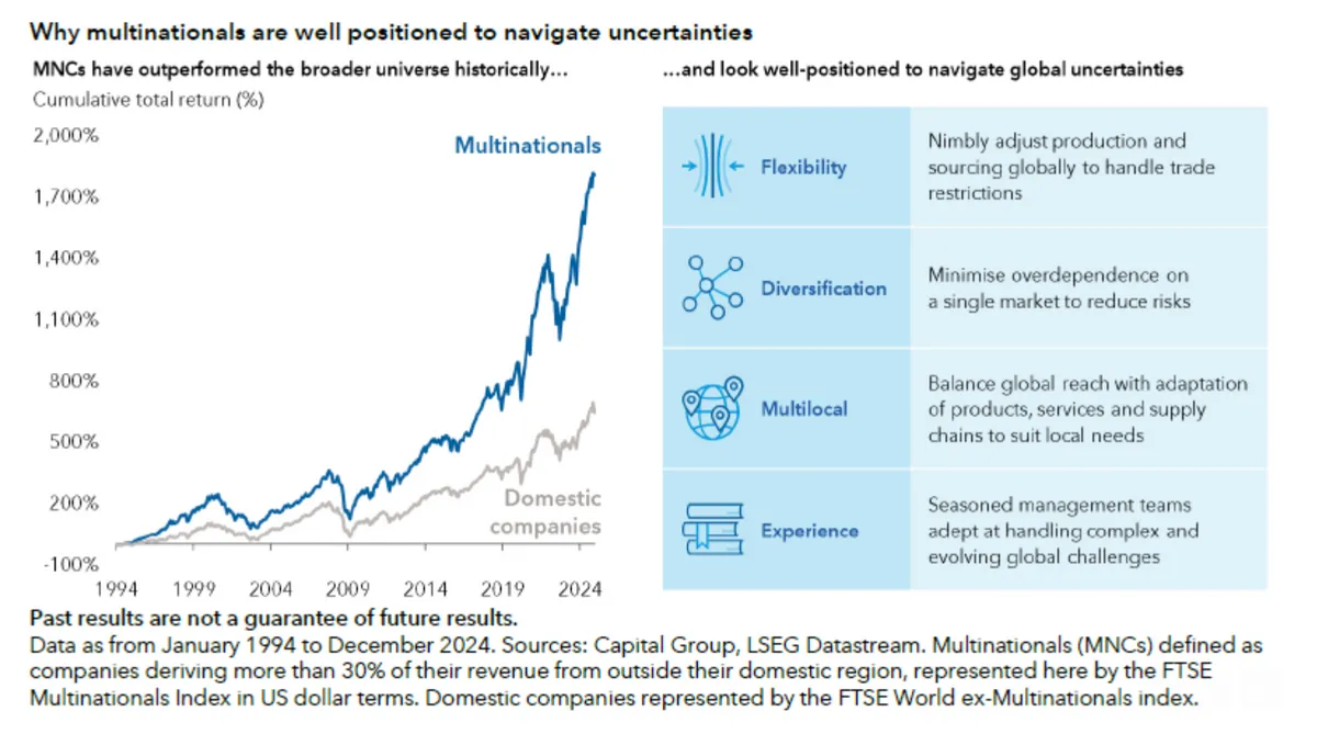 Los expertos de Capital Group definen a las multinacionales como “un grupo de empresas que ha demostrado ser especialmente eficaz a la hora de responder al cambio", ya que estas empresas de alcance mundial suelen estar bien preparadas para hacer frente a la incertidumbre y a las perturbaciones. En su mayoría, cuentan con equipos directivos sólidos y experimentados, capaces de desenvolverse en entornos diversos, incluso hostiles. Además, están acostumbradas a operar en todo el mundo y a encontrar formas de triunfar respondiendo con eficacia a la competencia local.
