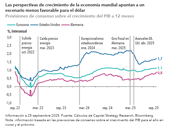 Ambas cosas están sucediendo ahora, lo que sugiere que el dólar emprenderá un giro cíclico a la baja durante los próximos doce meses, principalmente frente al euro. La cuestión de si esto se prolongará o no después de 2026 depende de que los diferenciales del crecimiento continúen reduciéndose.