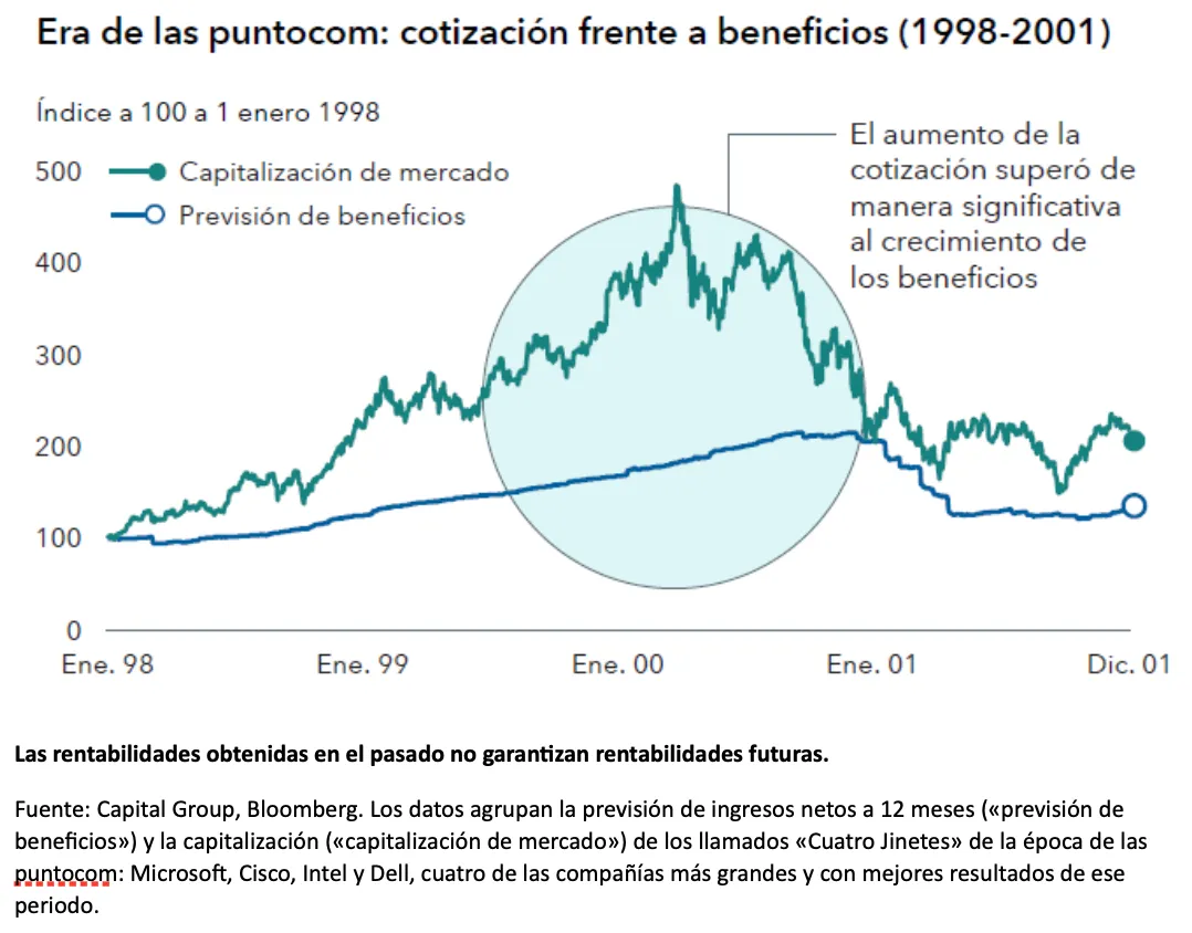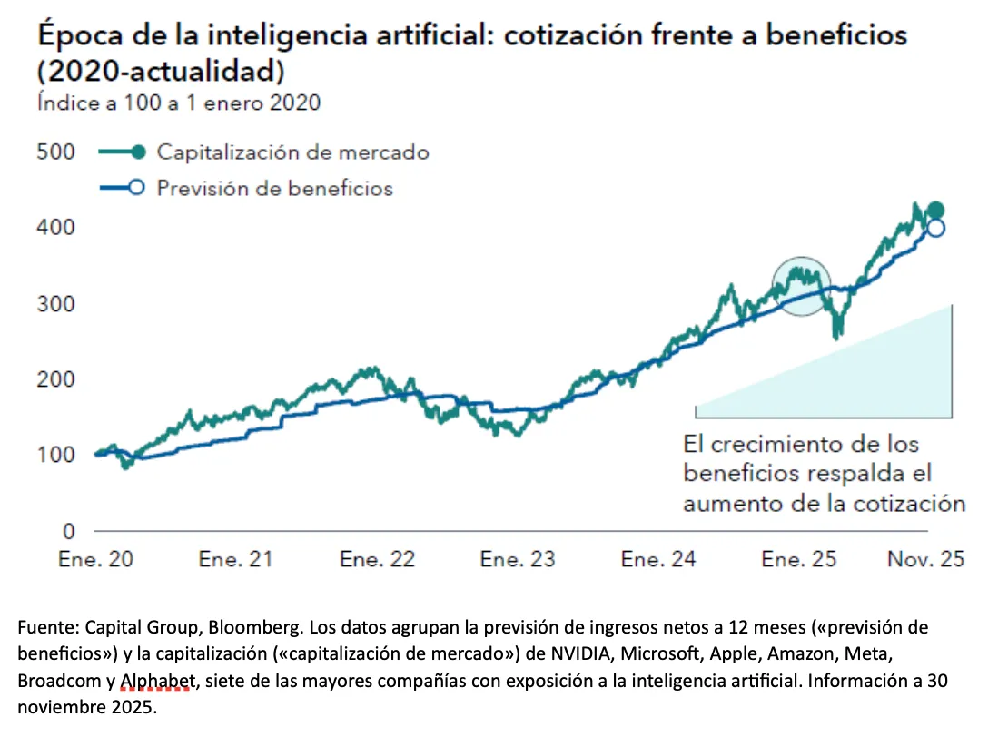La cotización de las grandes compañías de inteligencia artificial se ve respaldada por un sólido crecimiento de los beneficios. Además, las compañías que están realizando grandes inversiones relacionadas con la inteligencia artificial, como Alphabet, Amazon, Broadcom, Meta, Microsoft y NVIDIA, entre otras, pueden hacer frente a sus enormes gastos de capital con mucha más solvencia de la que mostraron las nuevas compañías de telecomunicaciones a finales de la década de 1990.