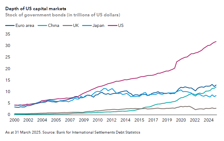 En las últimas décadas, Estados Unidos ha disfrutado de un período de excepcional fortaleza económica, superando constantemente a gran parte del resto del mundo. Esto se debió en gran medida al aumento de la productividad impulsado por la innovación y al crecimiento de la población activa, dos factores que atrajeron capital extranjero en busca de rendimientos elevados y estables. Estas entradas de capital impulsaron la expansión de los sectores de servicios de alto valor, en particular en el ámbito tecnológico, al tiempo que respaldaron un fuerte consumo interno.