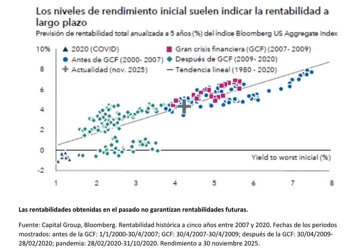 Históricamente, el yield to worst inicial ha sido un indicador fiable del potencial de rentabilidad a largo plazo. A 30 de noviembre de 2025, el índice Bloomberg US Aggregate ofrecía un rendimiento del 4,3%.