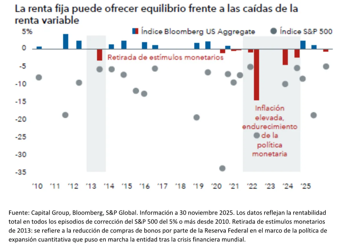 En caso de producirse una desaceleración significativa de la economía, la Reserva Federal tiene margen para recortar los tipos de forma drástica, lo que podría elevar los precios de los bonos. Los datos históricos nos muestran que estos ciclos de recortes de tipos han generado fuertes ganancias en los títulos de deuda de alta calidad, lo que refuerza su función como elemento de diversificación de la cartera.