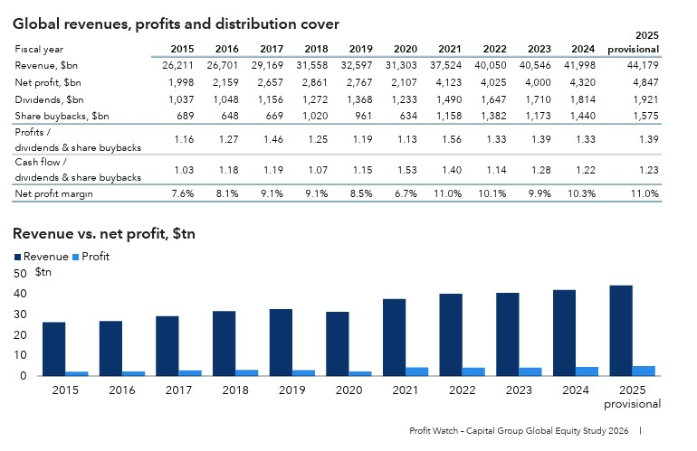 Según el estudio Profit Watch que forma parte del Global Equity Study de Capital Group, los beneficios globales crecieron con fuerza en 2025, alcanzando un récord previsto de 4,85 billones de dólares, lo que supone un aumento interanual del 12,2%.
