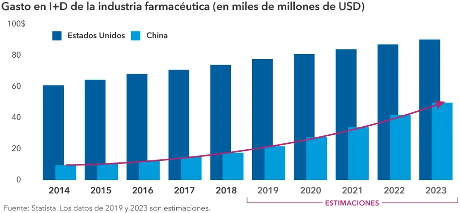 Por otra parte, no me sorprendería que cada vez aumentara más el número de avances farmacéuticos procedentes de fuera de EE.UU., que ha liderado tradicionalmente este ámbito. De hecho, es de esperar que muchos medicamentos de éxito procedan de China en 2030, puesto que cuenta con más pacientes de cáncer que ningún otro país del mundo. Además, es significativamente más fácil que dichos pacientes participen en ensayos clínicos. Preveo que comenzarán a producir nuevos fármacos para el cáncer en 5 o 10 años y que costarán una décima parte del precio de los fármacos estadounidenses.