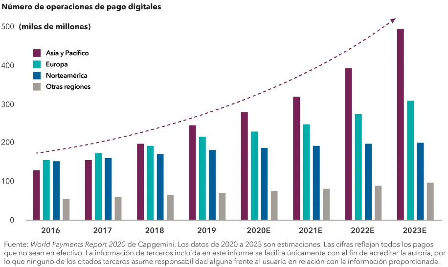 Las compañías con una gran presencia internacional podrían estar en condiciones de beneficiarse del aumento progresivo del uso de esta tecnología por parte de los consumidores. También hemos observado el crecimiento estable de pequeñas compañías ubicadas en países como Brasil que ofrecen plataformas de pagos a través del móvil para comercios.