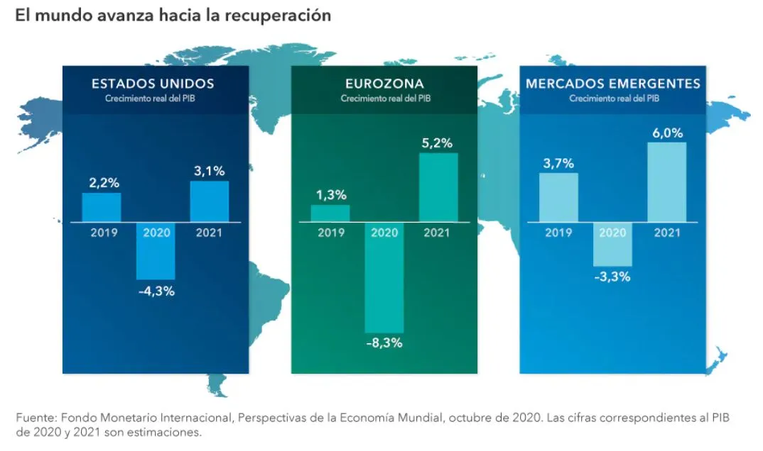 Los mercados de renta variable llevan meses prediciendo este resultado, dada su recuperación en una coyuntura económica desalentadora y en la que varios Gobiernos han impuesto medidas de confinamiento En lo que va de año, el índice MSCI World ha subido más de un 11% hasta mediados de diciembre, impulsado por el aumento de los valores de los sectores tecnológico y del comercio electrónico. Por su parte, los valores de los mercados emergentes han registrado incluso mejores resultados, impulsados por la recuperación de China, que ha sido la primera nación en sufrir los efectos de la crisis del COVID-19 y también en superarlos.