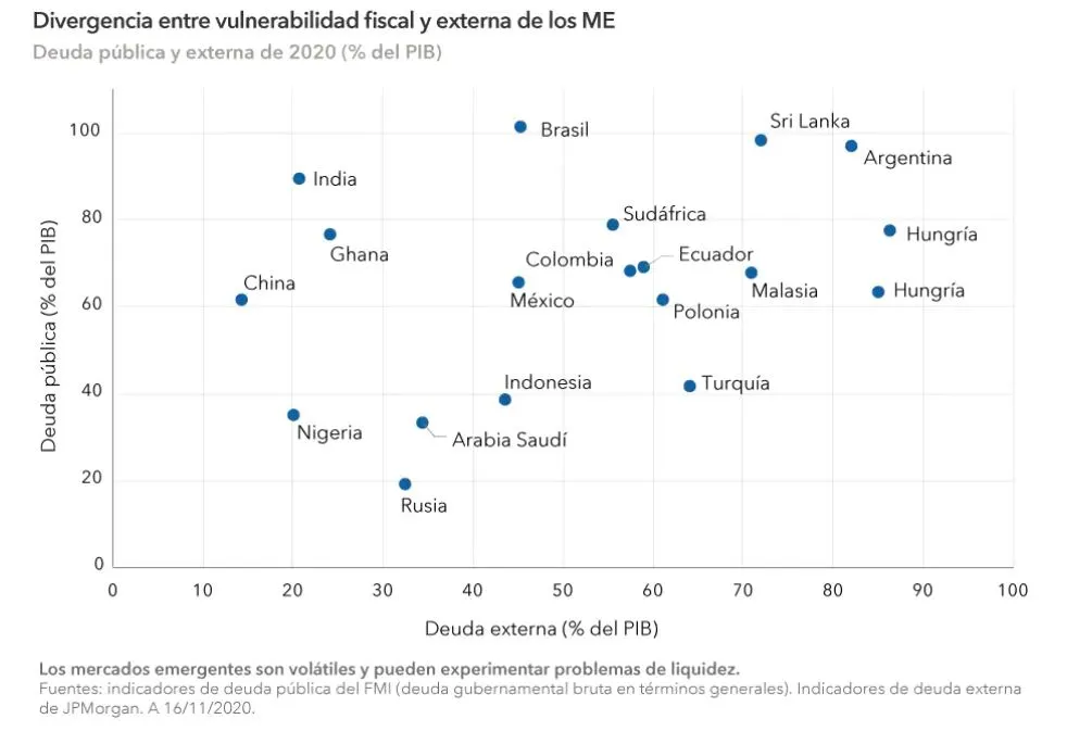 Dicho esto, existe una gran divergencia entre ME, con países como Argentina y Sri Lanka, que se enfrentan a elevados niveles de deuda pública y externa, y algunos de los exportadores de energía situados en el otro extremo del espectro. Si bien la problemática que supone el aumento del nivel de la deuda es un factor clave que debe sopesarse, creemos que las valoraciones atractivas en un entorno de recuperación del crecimiento del mercado desarrollado, los estímulos fiscales y monetarios puestos en marcha y el contexto geopolítico menos agresivo deberían conformar un telón de fondo robusto para la deuda de los ME en 2021.