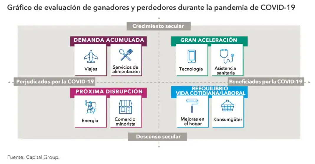 En opinión de Jared Franz, economista de Capital Group: «Tras la pandemia, la economía tendrá un aspecto muy distinto al que tenía en febrero de 2020. Será más eficiente y dinámica, pero dejará ganadores y perdedores. Nuestro papel como inversores activos es identificarlos; encontrar las compañías en crecimiento que no solo se han beneficiado gracias a la pandemia, sino que también tienen el potencial de seguir generando un crecimiento sólido en el mundo que nos espera tras la pandemia».