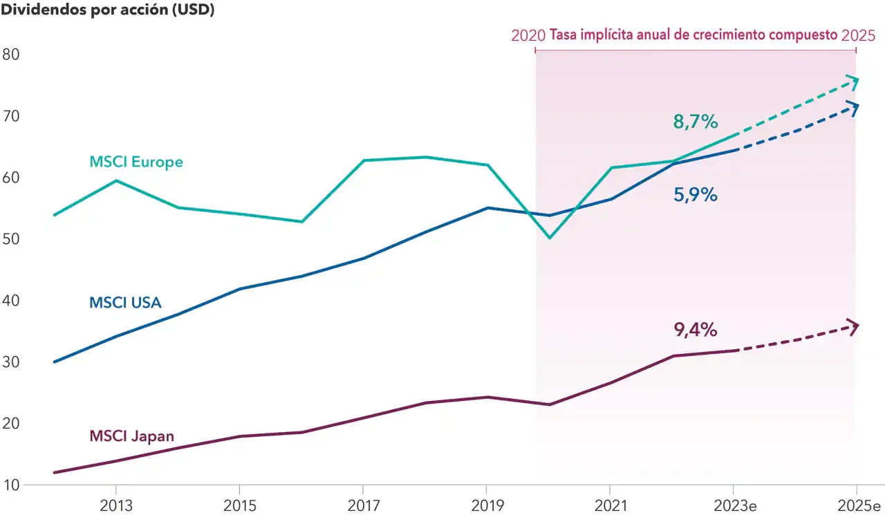 En un entorno como el actual, las compañías que reparten dividendos pueden cobrar mayor protagonismo, sobre todo si se mantiene la tendencia de desaceleración del crecimiento de la economía mundial y regresa la volatilidad de los mercados. Los mercados internacionales también cuentan con una ventaja en esta área, dado el mayor número de compañías con reparto de dividendos que están domiciliadas fuera de Estados Unidos y la importancia que otorgan a la retribución de los accionistas.
