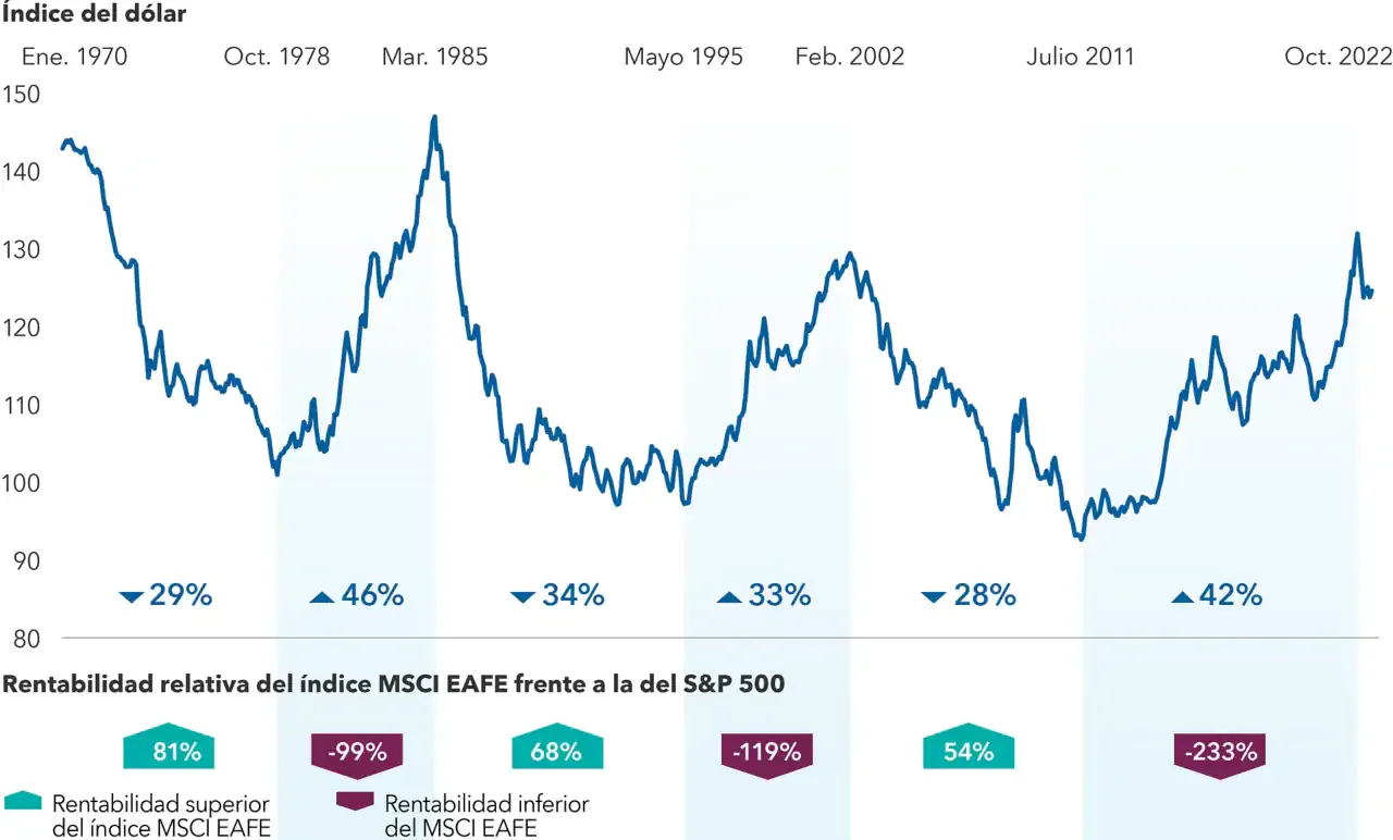 Las compañías no estadounidenses han repuntado en periodos de debilidad del dólar