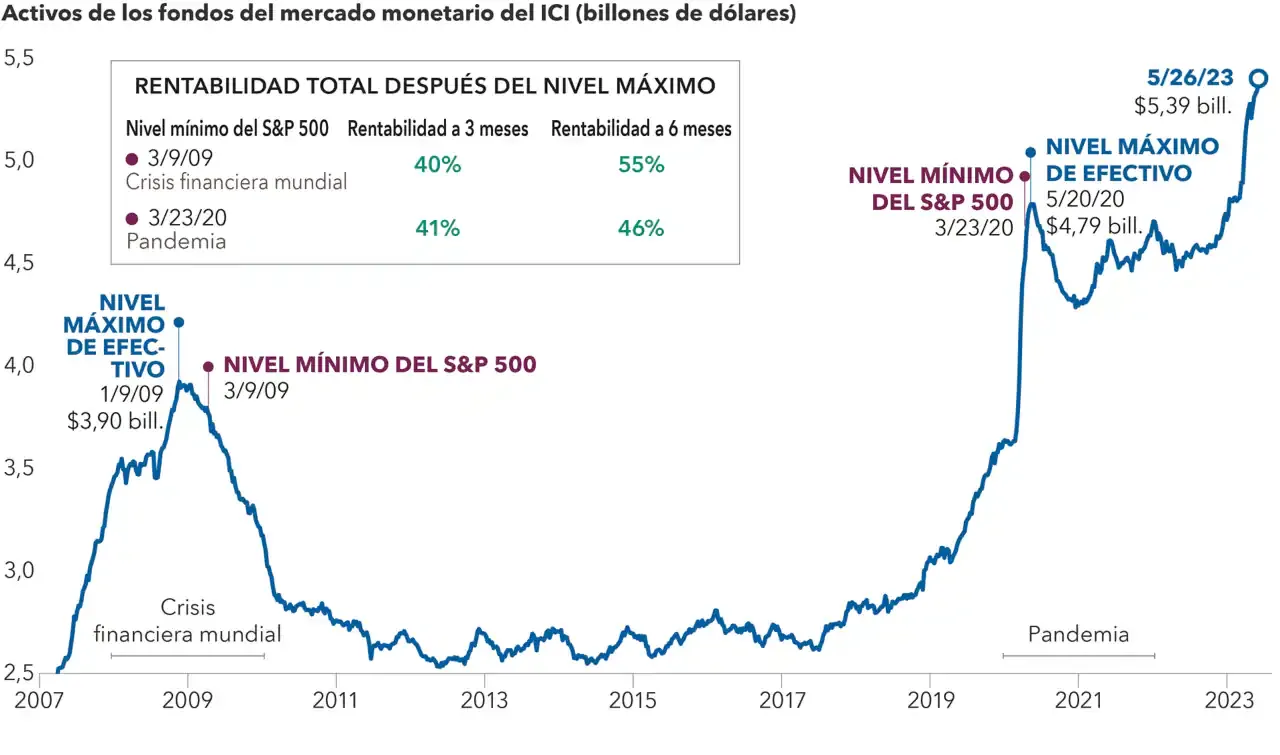 Ante estas y otras oportunidades, ahora puede ser el momento para que los inversores se planteen abandonar las posiciones en efectivo. En los últimos meses, los inversores han desplazado activos desde las inversiones en renta fija y variable al mercado monetario, que ha llegado a registrar un volumen sin precedentes de 5,39 billones de dólares a 26 de mayo de 2023.