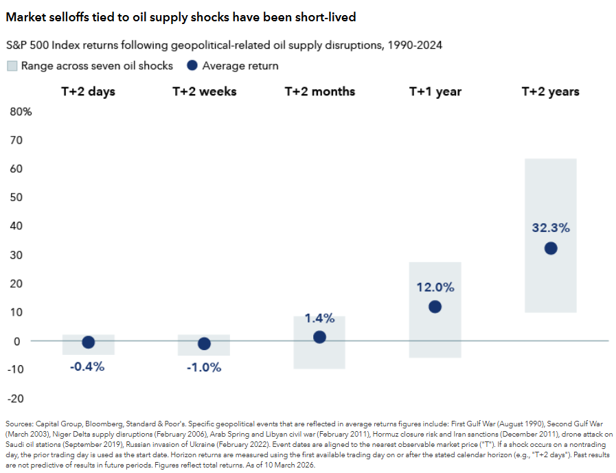 En el Gráfico de la Semana de Capital Group queremos ir a 2022. En aquella ocasión, la invasión de Ucrania por parte de Rusia provocó una conmoción geopolítica que sacudió los mercados y acaparó los titulares, al igual que ocurre hoy. El crudo Brent subió casi un 30% hasta alcanzar un máximo de 128 dólares por barril. Al mismo tiempo, los bancos centrales, con la Reserva Federal de EE. UU. a la cabeza, tomaron medidas agresivas para subir los tipos de interés, lo que agravó la incertidumbre de unos inversores que ya estaban nerviosos.