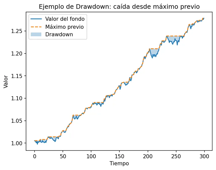 - Área sombreada: diferencia entre el valor actual y su máximo previo (drawdown)
