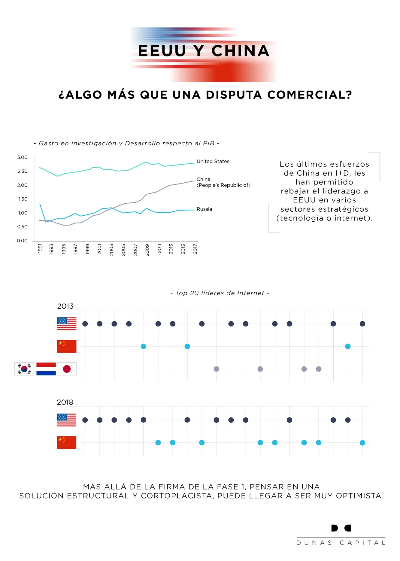 Conoce a través de esta infografía más sobre la disputa comercial entre China y EEUU que ha permitido rebajar ostensiblemente el liderazgo estadounidense en sectores estratégicos.