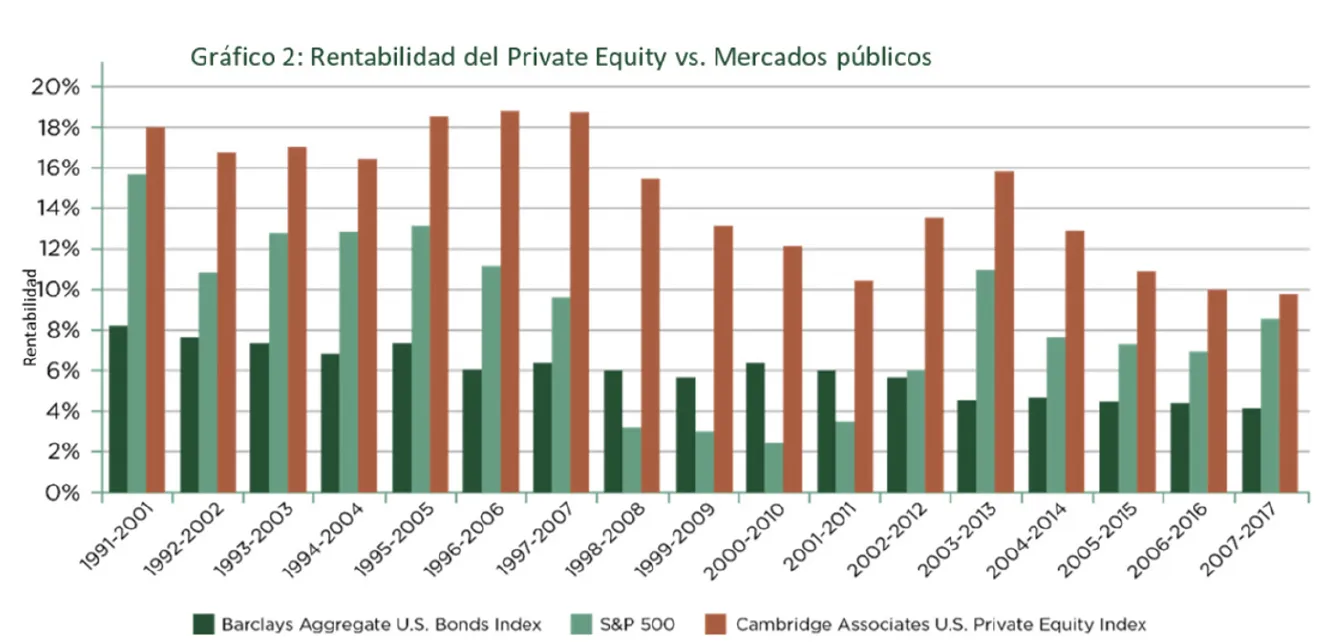 Desde 1991, durante cada ciclo de 10 años los retornos del private equity han superado consistentemente los retornos de los mercados cotizados (Gráfico 2).