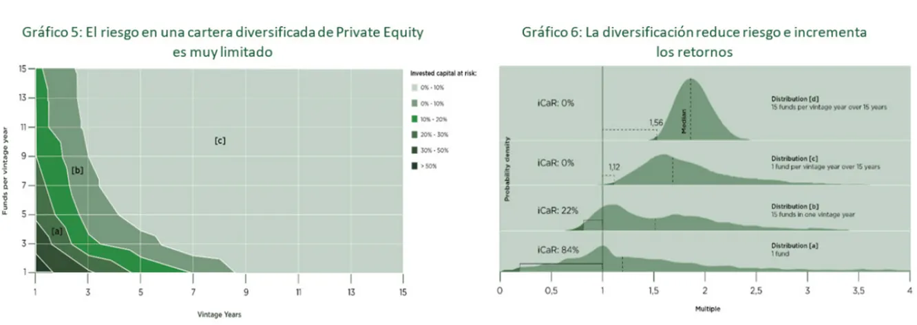 El riesgo de una cartera diversificada de private equity es limitado y a medida que se incrementan las añadas de cada fondo, se minimiza la probabilidad de pérdida de capital, y se mejora la rentabilidad esperada (Gráficos 5 y 6).