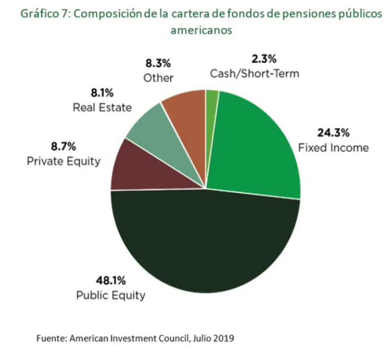 Los fondos de pensiones norteamericanos son un ejemplo de la presencia del capital privado en carteras de inversión institucionales (Gráfico 7).