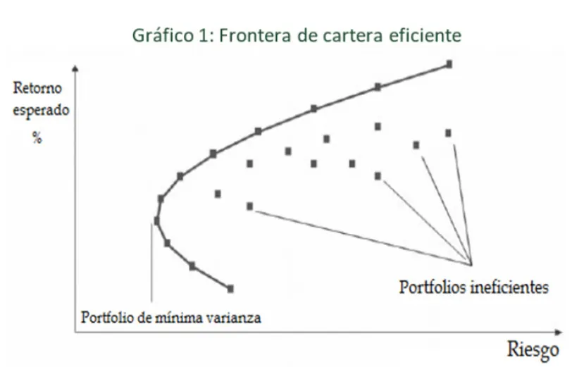 La frontera eficiente (Gráfico 1) es una curva que refleja las distintas combinaciones de carteras de inversión para diversos niveles de rentabilidad y riesgo. Actualmente, los gestores de cartera se esfuerzan por maximizar los retornos esperados asumiendo el menor riesgo posible, para lo cual deben diseñar carteras de inversión que reflejen combinaciones óptimas y que incluyan diversos tipos de activos.