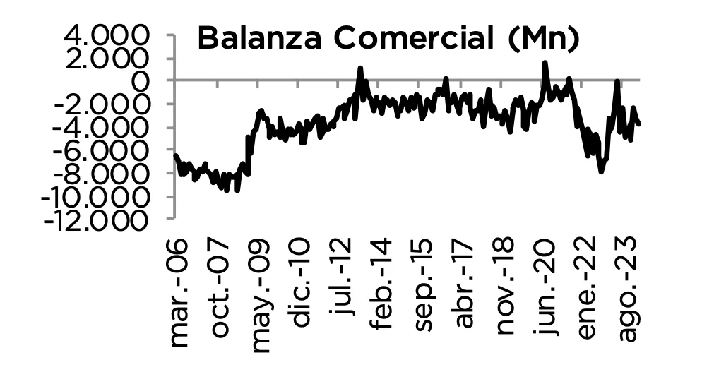 En marzo de 2024, el saldo comercial registró un déficit de 2.026 millones de euros, el mejor dato de los últimos 30 meses, con la excepción de marzo del año 2023 (-157 millones). En el 1T.24, las exportaciones alcanzaron los 93.430 millones de euros, lo que supone un descenso del –9% respecto al mismo periodo de 2023. Por su parte, las importaciones alcanzaron los 101.530 millones experimentando un descenso del –7.1% en su comparativa interanual.