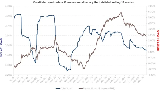 Este control activo del riesgo no implica renunciar a la rentabilidad. Al contrario, como muestra la evolución de la rentabilidad a 12 meses, el fondo ha sido capaz de generar retornos positivos de forma consistente, apoyándose en una gestión prudente y disciplinada.