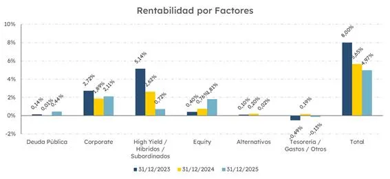 A lo largo del tiempo, vemos cómo diferentes tipos de activo, renta fija en sus distintos segmentos, renta variable o estrategias alternativas, van aportando a la rentabilidad en distintos momentos. Ninguno de ellos explica por sí solo el resultado final.