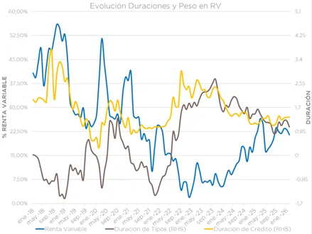 El gráfico anterior refleja bien esta idea. Si nos centramos en el periodo desde 2022, se observa cómo, ante un entorno de subidas agresivas de tipos, redujimos de forma significativa la duración —incluso a niveles negativos— para proteger la cartera, mientras manteníamos una exposición contenida a renta variable.
