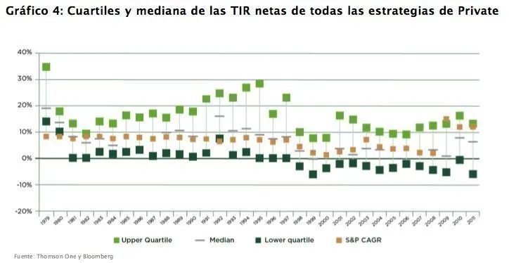 Adicionalmente, se requiere un conocimiento técnico bastante desarrollado para poder seleccionar a los gestores de fondos de capital riesgo y apostar por los que están mejor preparados para producir rendimientos elevados. Un factor para tener en cuenta a la hora de seleccionar gestores de private equity es la alta dispersión que hay entre los mejores y peores gestores como evidencia el Gráfico 4.