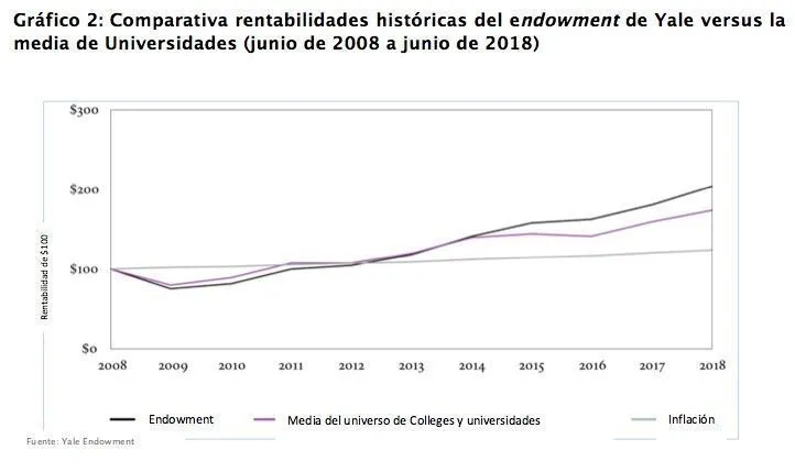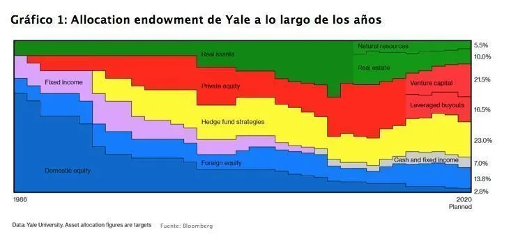 David Swensen, el gestor de la cartera del endowment de la Universidad de Yale, se ha convertido en una referencia indiscutible en el mundo inversor. Durante más de 30 años ha liderado las estrategias de inversión en Yale, alcanzando rentabilidades por encima de la media de otras universidades de forma consistente. Posterior a la explosión de la burbuja del año 2001, cuando el índice Nasdaq retrocedió un 30%, la cartera de Swensen rindió un 9,2%. La rentabilidad histórica desde 1998 hasta 2018 ha sido del 12,5% anual, en contraste con el S&P500 que rindió un 7,2%. Su estrategia ha sido simple: sobreponderar activos alternativos en la cartera de inversiones y tener un horizonte de rentabilidad de largo plazo.