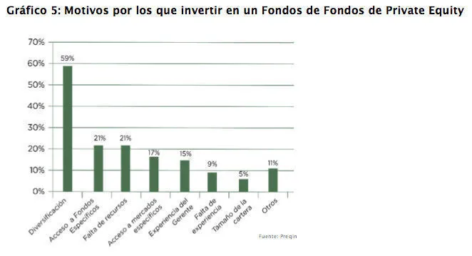 Para tener éxito a la hora de avanzar en una estrategia de inversión en capital riesgo, se requiere un equipo capacitado que sepa identificar, evaluar y seleccionar los mejores fondos, recursos que no todos los gestores tienen a su disposición. Una alternativa eficiente para este tipo de gestores es utilizar fondos de fondos. Este tipo de vehículo tiene la ventaja de facilitarle el acceso a diversos tipos de activos alternativos a aquellos inversores que no cuentan con las herramientas o el conocimiento técnico para hacerlo de forma directa. Una ventaja adicional y muy importante de este tipo de vehículos es la elevada diversificación que puede alcanzarse, lo que disminuye de forma sustancial el riesgo asumido. El Gráfico 5 refleja las razones por las cuales un inversor institucional opta por un fondo de fondos.