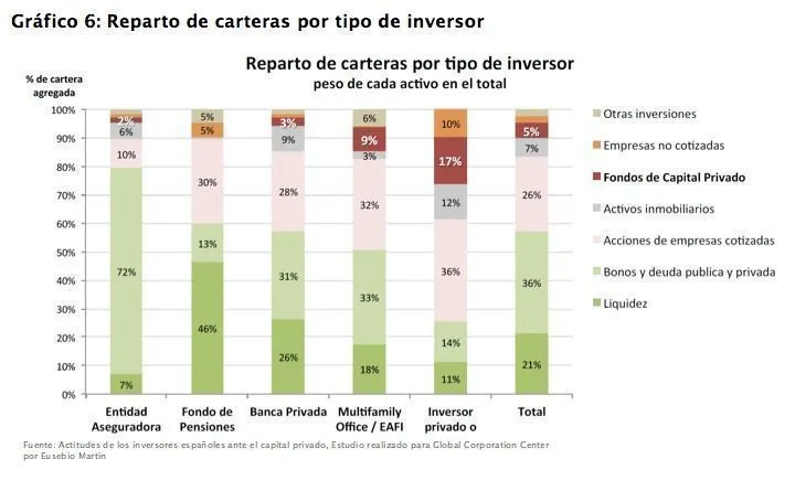 En el caso español, llama la atención la escasa asignación de activos alternativos que tienen las carteras de inversión de los inversores institucionales. El Gráfico 6 ilustra este punto. Se observa una clara preferencia por instrumentos de deuda pública y efectivo, en detrimento de activos más rentables como los alternativos.