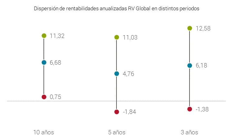 Y la diferencia de rentabilidad entre una opción (los 10 más grandes) y otra (los 10 más rentables) es importante: a diez años, en renta variable es de casi tres puntos porcentuales, en renta variable mixta es de más de dos puntos y medio y en renta fija mixta hay un 2,3% de diferencia. Además, hay una gran dispersión entre unos planes y otros dentro de cada categoría (ver gráfico). Por ejemplo, en renta variable global a 10 años hay más de diez puntos de diferencia entre el más rentable (11,32%) y el menos rentable (0,75%).