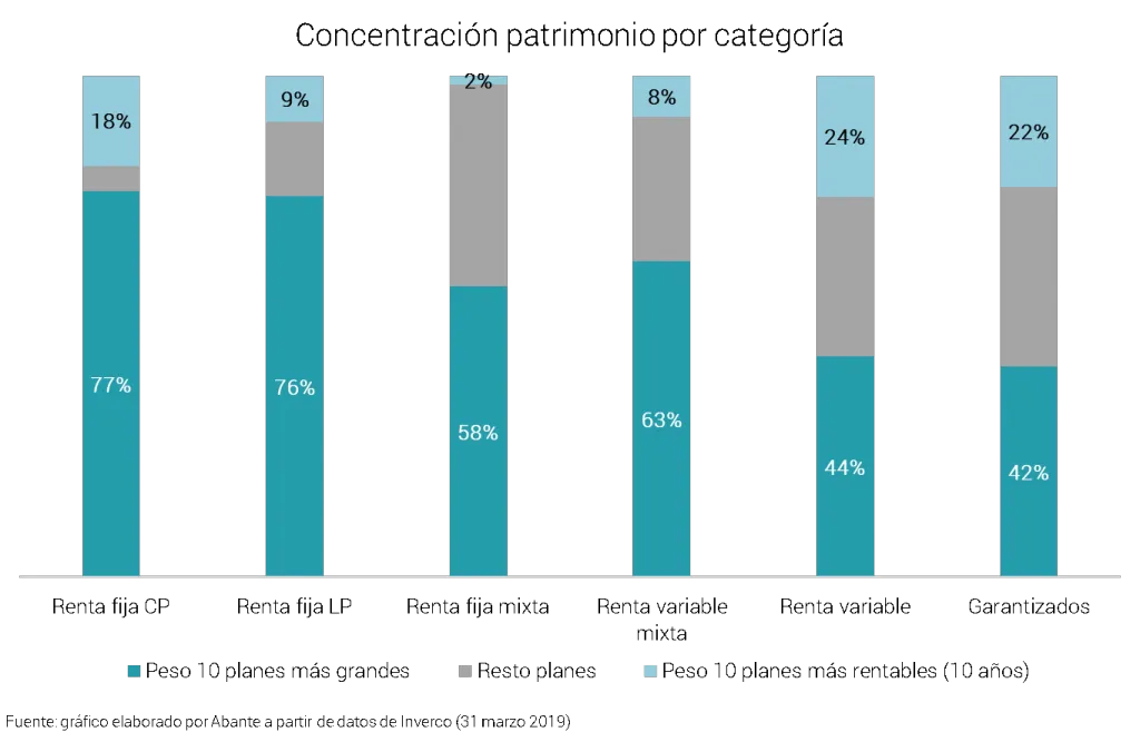 Como se observa en el siguiente gráfico, en los planes mixtos, dos tercios del patrimonio se encuentra invertido en los 10 planes más grandes y apenas el 2% (en renta fija mixta) y el 8% (en renta variable mixta) está invertido en los 10 planes más rentables. La diferencia en renta variable es menor, pero todavía es amplia: el 24% del ahorro está invertido en los planes más rentables y el 44% en los más grandes.