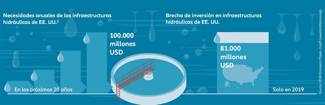 Es un esfuerzo importante, pero insuficiente. Solo en 2019, la brecha de inversión acumulada en infraestructuras hidráulicas fue de 81.000 millones de dólares. Otros cálculos sugieren unas necesidades anuales de más de 100.000 millones de dólares durante los próximos 20 años.