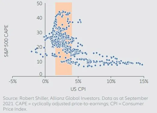 - En el caso de la renta variable, las tasas de inflación de un solo dígito bajo o medio resultaron ser una tasa "hurdle" crítica para determinadas variables económicas. Del análisis se desprende que las valoraciones de las acciones estadounidenses, basadas en la ratio precio/beneficios ajustada con respecto al ciclo (CAPE), tendieron a situarse en un punto óptimo con tasas de inflación entre 1,5% - 4% aproximadamente (véase el Gráfico 4). No obstante, cuando la inflación continuó subiendo, los múltiplos tendieron a bajar.