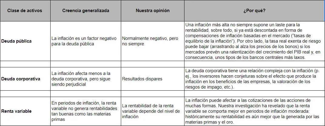 Gráfico 1: la opinión del consenso puede simplificar en exceso el efecto que la inflación produce en las principales clases de activos