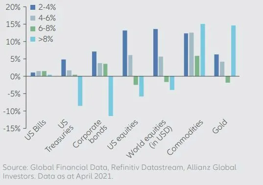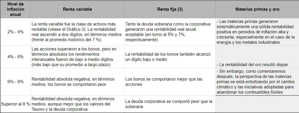 - Nuestra investigación reveló que con una inflación moderada (2% - 4%), la renta variable era la clase de activos más rentable, pero los bonos soberanos y corporativos también generaron rentabilidades reales anuales positivas.