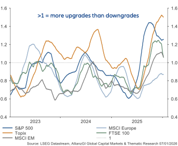- Los mercados de renta variable de las economías emergentes, en los que los inversores siguen estando poco expuestos, ofrecen una combinación de crecimiento económico sólido (especialmente fuera de China), condiciones financieras y monetarias favorables, revisiones al alza de los beneficios empresariales y valoraciones atractivas. Mercados como Corea del Sur y Taiwán se están beneficiando del auge de las acciones tecnológicas, mientras que otros, como India, siguen contando con unos fundamentos sólidos. América Latina debería beneficiarse cada vez más del aumento de los precios de los metales. Sin embargo, a corto plazo, el panorama en esta última región se ve empañado por los acontecimientos en Venezuela.