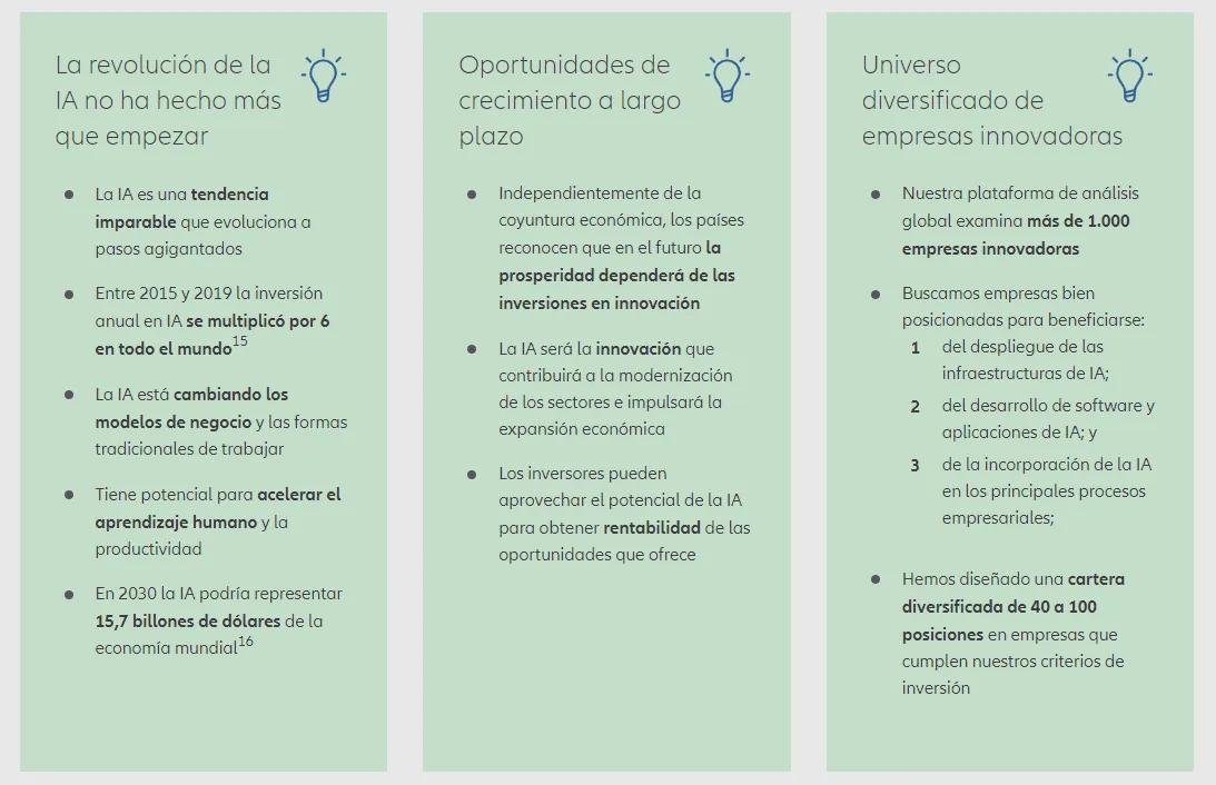 Las inversiones en instituciones de inversión colectiva conllevan riesgos. Las inversiones en instituciones de inversión colectiva y los ingresos obtenidos de las mismas pueden variar al alza o a la baja dependiendo de los valores o estimaciones en el momento de la inversión y, por tanto, Usted podría no recuperar su inversión por completo. Allianz Global Artificial Intelligence es un sub-fondo de Allianz Global Investors Fund SICAV, una sociedad de inversión abierta de capital variable organizada de acuerdo al derecho de Luxemburgo. El valor de las participaciones/acciones que pertenecen a las Clases de Participaciones/Acciones del Subfondo denominadas en divisas distintas de la divisa base puede estar sujeto a una volatilidad considerablemente incrementada. Es posible que la volatilidad de otras Clases de Participaciones/Acciones sea diferente. La existencia de rendimientos pasados no es promesa ni garantía de rendimientos futuros. Las inversiones en una moneda diferente a la moneda del país en el que reside pueden estar sujetas a fluctuaciones de cambio de moneda al alza o a la baja. El presente documento no es una oferta o invitación a invertir en los fondos. Los fondos pueden no estar disponibles en todos los territorios o ciertas categorías de inversores. Únicamente para su distribución si así lo permite la legislación aplicable y en especial no disponible para residentes y/o nacionales de EE. UU. Las oportunidades de inversión aquí descritas no tienen en cuenta los objetivos de inversión específicos, la situación financiera, conocimiento, experiencia o necesidades particulares de cualquier tipo de inversor y no están garantizadas. Las opiniones y los pareceres expresados en el presente documento, que están sujetos a cambio sin previo aviso, corresponden a las sociedades emisoras en el momento de la publicación. Los datos utilizados se han obtenido de diversas fuentes y se consideran correctos y fiables en el momento de la publicación. Las condiciones de cualquier oferta o contrato subyacente que se haya realizado o celebrado —o que se pueda realizar o celebrar— prevalecerán. Allianz Global Investors Fund está inscrito para su comercialización en España en la Comisión Nacional del Mercado de Valores (la “CNMV”) con el número 178. Los precios diarios de las acciones/participaciones de los fondos, el documento de datos fundamentales para el inversor, los estatutos/reglamento de gestión, el folleto y los últimos informes financieros anuales y semestrales pueden obtenerse gratuitamente de la sociedad gestora Allianz Global Investors GmbH en el país de domicilio del fondo, Luxemburgo, o del emisor en la dirección abajo indicada o en www.allianzgi-regulatory.eu . Lea con atención estos documentos, que son vinculantes, antes de invertir. Esto es material publicitario emitido por Allianz Global Investors GmbH, www.allianzgi.com, con domicilio social en Bockenheimer Landstrasse 42-44, 60323 Fráncfort/M, supervisada por la Bundesanstalt für Finanzdienstleistungsaufsicht. Allianz Global Investors GmbH tiene una Sucursal en España, con domicilio en Serrano 49, 28001 Madrid que está inscrita en el Registro de la Comisión Nacional del Mercado de Valores con el número 10. No está permitida la duplicación, publicación o transmisión de su contenido, independientemente de la forma.