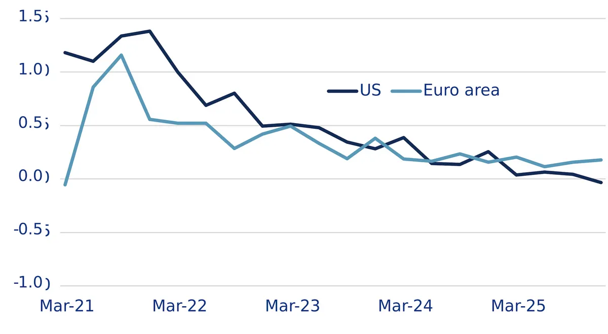 No aplicaríamos esta analogía sin reservas al éxito relativo de Estados Unidos y la zona del euro en la generación de crecimiento del empleo, pero al menos resulta llamativo —como se muestra en el gráfico de la página siguiente— que, tras haber quedado rezagada durante mucho tiempo en la recuperación inmediata tras la COVID, la zona del euro registrara un crecimiento del empleo más fuerte que Estados Unidos en todos y cada uno de los trimestres de 2025. A pesar de la mejora en el crecimiento de las nóminas observada en enero (quizás impulsada temporalmente por las condiciones meteorológicas favorables), la mayoría de las razones del cambio en el rendimiento relativo se encuentran en Estados Unidos. La combinación del impacto retardado de la política más restrictiva de la Reserva Federal, los efectos del aumento de los costes para las empresas estadounidenses como consecuencia del incremento de los aranceles y el endurecimiento de los controles migratorios por parte de la Administración se unieron para frenar el crecimiento del empleo en Estados Unidos el año pasado, creando una situación de estancamiento inusualmente poco dinámica, sin contrataciones ni despidos. Por el contrario, como en la fábula, el empleo en la zona del euro se ha mostrado resistente y sin grandes cambios.