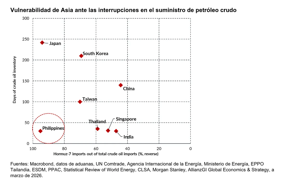 Oriente Medio tanto para el petróleo crudo como para el GNL. Filipinas e India están especialmente expuestas debido a su elevada dependencia de las importaciones y a sus limitadas reservas. Singapur, Tailandia y Taiwán se enfrentan al mayor riesgo en materia de generación de electricidad debido a su elevada dependencia ddel GNL para la producción de energía; aunque las fuentes de suministro están diversificadas, una interrupción prolongada en Ormuz seguiría tensando el sistema.