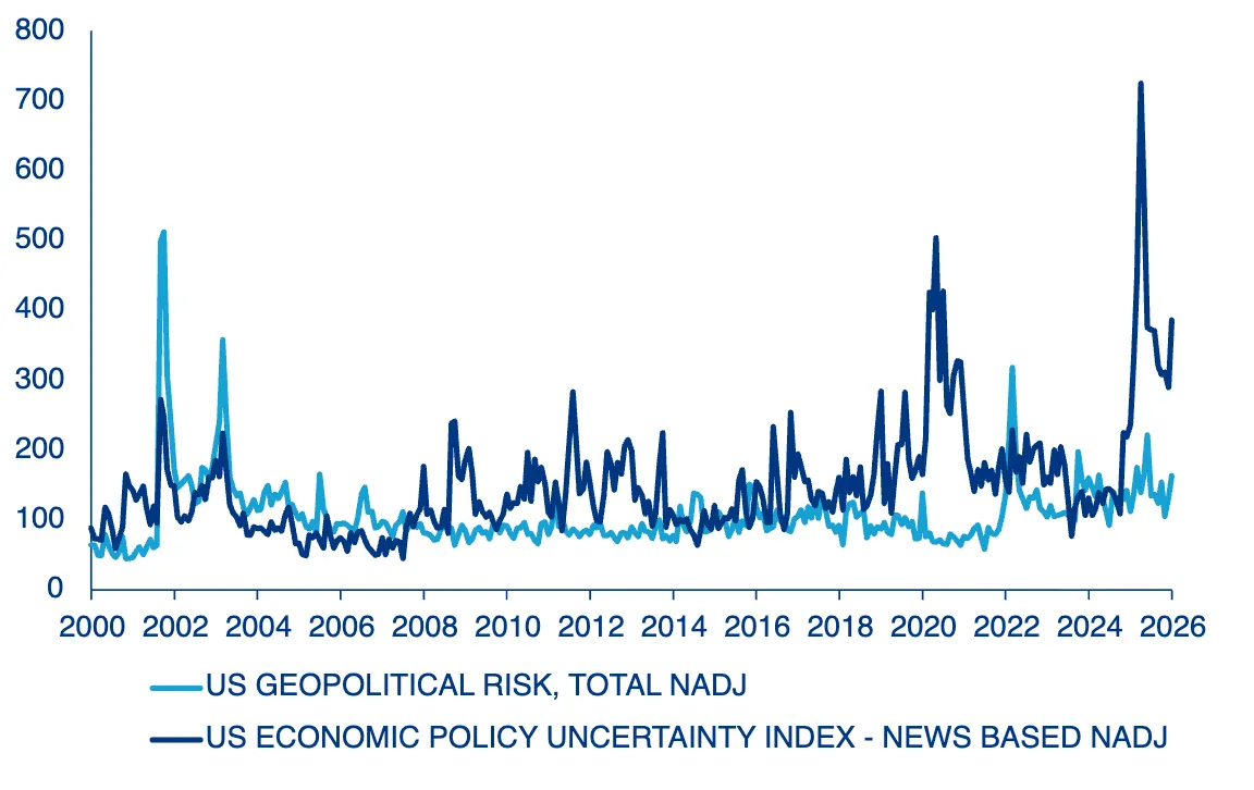 De hecho, los dos índices de riesgo geopolítico e incertidumbre sobre la política económica —que siguen las palabras clave en los principales diarios— han subido ligeramente, aunque partiendo de niveles ya elevados (véase nuestro gráfico de la semana). Esto sugiere que la cobertura informativa relacionada con el riesgo se ha intensificado una vez más.