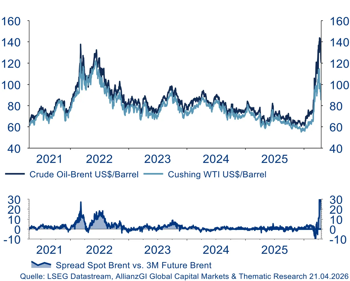 que provocó una fuerte caída de los precios del petróleo. Poco después, sin embargo, el péndulo se inclinó en sentido contrario, ya que la reapertura seguía estando sujeta a condiciones políticas y militares. La situación dio otro giro, y la incertidumbre sobre el paso efectivo por este cuello de botella provocó que la prima de riesgo en el mercado del petróleo volviera a subir. Esto provocó grandes oscilaciones diarias en los precios del Brent y del WTI (West Texas Intermediate), mientras que los mercados de renta variable oscilaban entre repuntes impulsados por el alivio y una renovada aversión al riesgo.