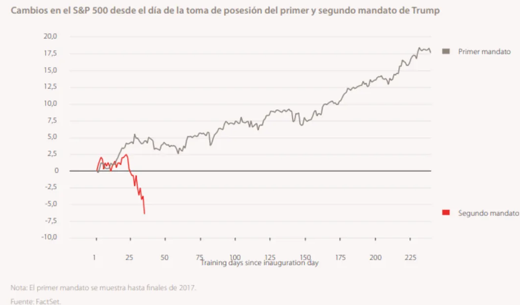 En lo financiero, 2025 no arranca según el esperado guión. Retornos negativos de las bolsas americanas, Japón, India, con caídas más intensas entre las tecnológicas, debilitamiento del dólar, retrocesos entre las criptomonedas, compras de renta fija americana y emergente… Y, todo ello, en contraste con una renta variable europea al alza, un euro más fuerte, ventas en los bonos europeos… divergencias. ¿Estamos ante el fin del “excepcionalismo” americano? ¿Son las empresas europeas de defensa las nuevas 7 Magníficas? ¿Entrará Estados Unidos en recesión?