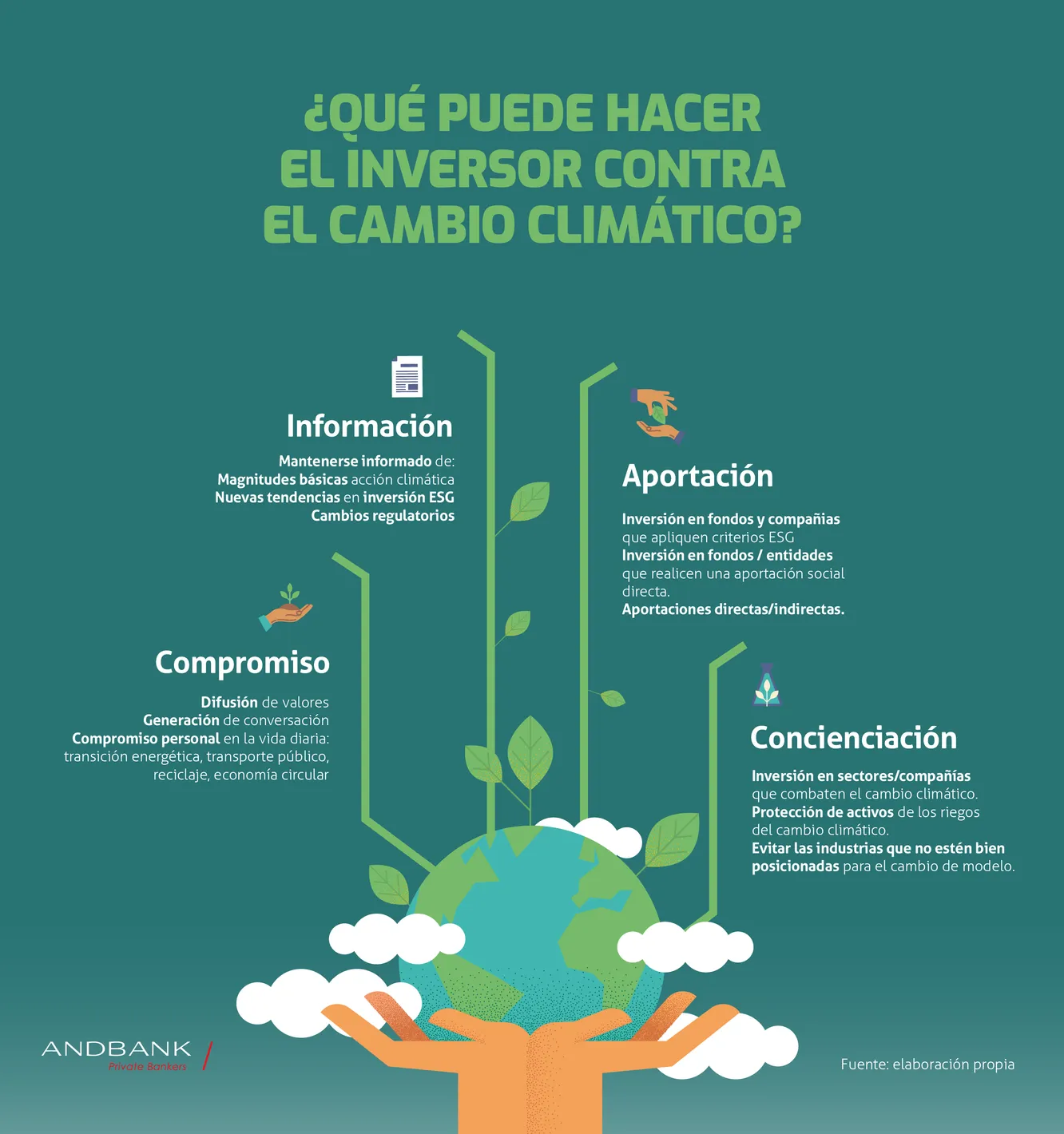 El cambio climático es percibido ya de forma generalizada como una amenaza a nuestro planeta y a nuestra forma de vida. El reto hoy es aportar desde todos los ámbitos para reducir el impacto de la actividad del hombre en la Tierra. Desde la inversión podemos adoptar un papel activo, invirtiendo en compañías que cumplan en su actividad con criterios ESG: medioambientales, sociales y de buen gobierno empresarial, o bien buscando un impacto directo de nuestra inversión en proyectos que apuesten por innovación, medioambiente, derechos humanos, lucha contra el cáncer y otras muchas aportaciones a la sociedad del futuro. También participando cada uno desde su estilo de vida en difundir conceptos como economía circular, inversión responsable o transición energética.