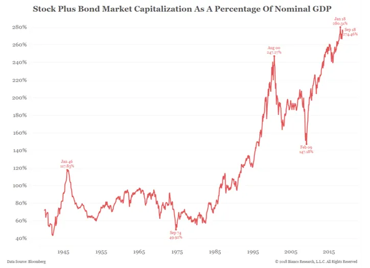 (Ver gráfico abajo con la suma del valor total de la bolsa y mercado de renta fija americana respecto del PIB desde 1940, que refleja un pico a finales de 2018 sin precedentes en la historia, y que ya se ha superado en 2019). - Que la dispersión en valoración entre las compañías baratas y las caras es mayor que nunca o, al menos, tan alto como en la burbuja punto.com de hace 20 años.